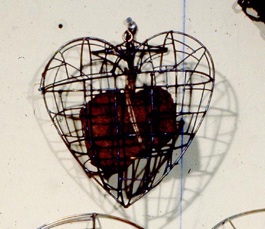 provide a curatorial rationale for the show. Jim Pallas is an artist of the amazing imaginative scope, funny, irreverent, entertaining. But the compulsion to include more than enough work in too many media did not serve him well. The funky electronic sculptures would have sufficed to indicate his skills and his aesthetic; the addition of a print, souvenirs of various performances and a series of wall mounted heart shapes gave an unfortunate character to Pallas's share of the exhibition. This kinetic sculptures -- made of wire, cord, motor, plastic bags, reflectors, beads, and more call for audience participation, responding to sounds, motion, or he changes in their environment. Toady, a weird-looking 4' bird with a long wire beak, puffs up and bows upon sensing the viewers approach. Another inflating object, a big wire portrait bust with the ballooning cranium, becomes an exercise in self mockery with the addition of its surprising title; Portrait of the Artist to Be Viewed While Saying "You're Great! You're Terrific! What a Genius." Pallas's sense of humor is friendly and engaging. ... Dialogue Magazine, September 1986 |