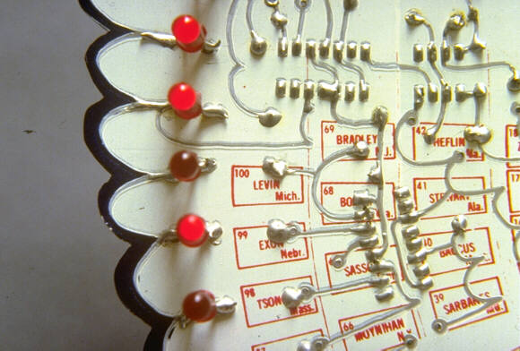 The open wings of the Senate eagle suggested the semi-circular shape of theSenate's seating chart so I reproduced the desk assignments in the silk-screened image on the printed circuit board of the "Main Piece". The artwork was created in 1980, during Senator Levin's first elected term and the desks, like most privileges in Congress, are assigned by seniority. Levin's seat sat as far from front and center as could be. He has continued to win re-election so now his desk is positioned closer to the center of action.