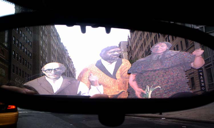 Me Back"All three hitchhikers - Monk, Lenni and Saul - arrived at Columbia University’s Macy Gallery right on schedule and were placed on the streets of New York in the late afternoon of May 14, 2011. They were to be picked up by strangers, taken to locations that held meaning for each of these historical figures, and be returned to the gallery in time for the opening of an art exhibit titled "Game Show NYC." The website tracking their movement via a geo-location devicewas up and functioning well. Their starting locations and subsequent movements can be seen on their respective web pages whose links are below. Within a short period, Monk was on the move, going from his starting spot at W. 64 St. to Thelonious Monk Circle where he spent the night Saturday, May 14, 8:01:58 PM to Sunday, 1:01:55 PM. He reported in from W. 61 St and West End Ave at 1:41 P.M. before being taken over to W. 68 St. and near Broadway where he spent an hour or so. At 4:02 he reported in from all the way uptown at W 73 St and West End Ave. Next he was on the Major Deagan Highway at 5:02 P.M. and at 7:01 he's reported in at E 227th St and Lowerre Place in Edenwald, a suburb of New York where he stayed Sunday night. By Monday morning, the Monk geo-tracker signaled from a trash dump at the mouth of Long Island Sound across from LaGuardia. Curious, but still, an interesting choice of locations. Over the next two days, the geo-locator reported in from various places within the dump as if shoved around by bulldozers until it stopped reporting, probably due to battery failure or inability to get cell phone service. Lenni enjoyed the view from Chelsea Waterside Park at W 26 St where she was dropped off that Saturday at 5:02 P.M. until the early morning hours when she was taken inland a half block down Hat Street to the School of Visual Arts. She reported her last position there at 11:01 Sunday Morning. The Hitchhiker of Saul Steinberg was positioned on the northeast corner of Washington Market Park on Saturday, May 14, 2011 5:02:02 PM and there he stayed two days until Monday, at 2:02:00 AM. He next reported in from Collister between Greenwich and Hudson at 2:26 A.M., apparently on his way to Bank Street between Greenwich and Washington where his last contact was from at 3:03 A.M. Clicking on the animated image displays time of the location report. To see maps that include location points and accounts of the individual HitchHikers click on their links below. The black arrow marks their exact location. It looked like the project was off to an interesting and varied start. Another twenty-four hours passed, and there was no further movement from any of the three. As time went on, it was starting to look as though all might not be well. Indeed, those three locations were the final destination for the three tracking devices, making it clear that the tracking devices for Lenni and Saul had been disabled or confined to areas of no cell phone service until their batteries died. There was no denying the obvious conclusion: The hitchhikers were stolen within their first two days on the street. The timings suggest that three different individuals were the thieves. What made me think that a hitchhiker project could possibly be successful on the mean streets of NYC? In 2006, I had done a similar project,"Pioneers in the Valley of the Heart's Delight" for a city festival in San Jose, Ca. sending five Hitch Hikers on an ambitious cross-country journey. Four made it to their various destinations in California’s Silicon Valley. These Hitchhiking sculptures were portraits of six individuals (one sculpture was of two individuals, William Hewlett and David Packard.) who were instrumental in the digital revolution. The Hitchhiker of James Terman, which started out in Cambridge, MA., actually traveled across the entire continent and arrived at it’s designated destination! The people who picked those pieces up phoned or emailed the project's contact person as requested. They emailed photos of the adventures they took the Hitchhikers on. They knew the stories of the persons represented by the sculptures and identified with them. They wanted to be part of the effort to see these symbols of inventiveness and entrepreneurial spirit arrive at their destinations. This gave me reason to believe that at least one Hitchhiker would make it to its final destination starting out in NYC and ending in NYC. But New York is a special place, an arts and cultural center, and the fact is, my Hitchhikers unfortunately have a particularly strong appeal in art communities. Since 1981, I've made 30 Hitchhikers. My first 22 Hitchhikers were portraits, 20 of them portraits of the individuals who posed for them with the understanding that they could keep them for 1 year, but by the end of the year they were required to write anything they wanted on the back and abandon their Hitchhiker on the street/road of their choice within that year. People initially agreed to the deal, but later several reneged and did not abandon their portrait Hitchhiker in good faith. All who reneged were members†of the art community - artist, designer, writer. Only one, Ray Johnson, was honest about not putting it on the road. When confronted, he admitted that he couldn't give it up. He had grown attached to it.It was found in his estate after his death.His heirs agreed to return it to me. but it has disappeared from Richard Feigen Gallery in New York, where it was stored.The others rationalized, dissembled or remained silent. Art and art acquisition are very much a part of New York, as are greed and ambition. I knew that putting Hitchhikers on the streets of New York would be risky.Hitchhiking is risky.But I believe the true value of these sculptural pieces, the actual painted cut outs, is their role in creating stories.The collection of the stories and the images and documents that support those stories are the real artwork.At first the collection was represented in a loose-leaf binder