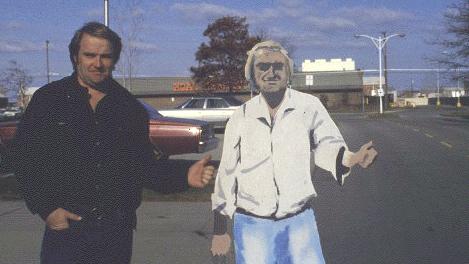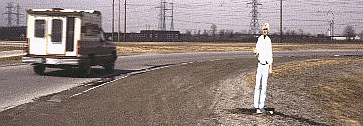 Barr ironically chose to send his Hitchiker to Greenland because that land is under three kilometers of ice and has no roads. Tony McAuley, a Toronto artist, set it here by the north bound roadside of 401 in Ontario, Canada, where it was last seen.