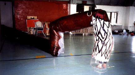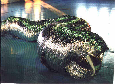My second attempt, utilising a material and technique I had used before in museum installations, consisted of a painted polyethelene tube inflated by a blower. This is rolled up in such a manner that once the dancers are in it, it is inflated and thus makes it's entrance by "growing" onstage. The dancers inside guide and animate the tube to perform a pas de duex with the angry dancer who is eventually engulfed by the serpent for the finale.
