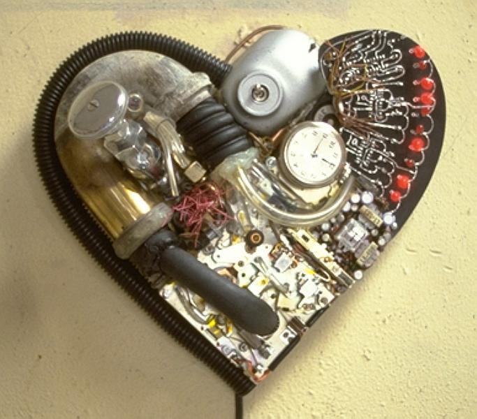 The red LEDs of this kinetic heart beats with a binary syncopation to the audio accompaniement of two small VU-meters. The "seconds" hand of a pocket watch appears to stop as the watch itself is rotated in a counter clockwise direction. the barely audible, ticking meters phase with the ticking watch.