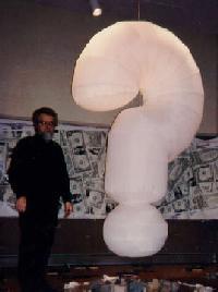 Hanging from overhead, this eight foot high, white question mark is a crumpled drape of white rip stop nylon cloth until the computer turns on its quiet 4 inch fan, whereupon it slowly (20 seconds) inflates. The rate of inflation (or deflation) is controlled to elicit donations.