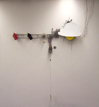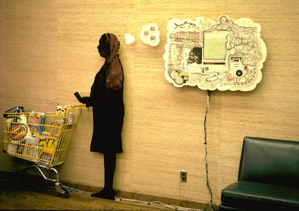 6 x 9 x 13' feet Black, painted, plywood silhouette, half of shopping cart, items from store shelves, circuitry. |