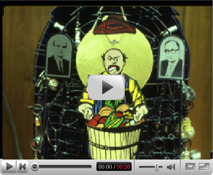 The Thought Bubble of the Shopping Goddess is the brain of the Farmer Jack Piece. It distinguishes soft sounds from loud ones, monitors ambient light levels in the environment and detects the movement of people in front of it. Much of its circuitry monitors and records these activities for varying lengths of time, compares this data and controls the various functions and actions of the other sculptures. The behavior of the three sculptures is related to activities around it. Two features within the THOUGHT BUBBLE are the "Oracle" and "the Graph". The "Oracle" generally displays messages relating to the business but sometimes the messages are fits of cursing triggered by specific office events. On rare occasions, it displays personal messages to Mr. Borman. "The Graph" is a 16 by 16 grid of green LEDs (light emitting diodes) capable of creating bar charts and line graphs or simply tracing random figures. The activities of "the Oracle" and "the Graph" can be coordinated. |