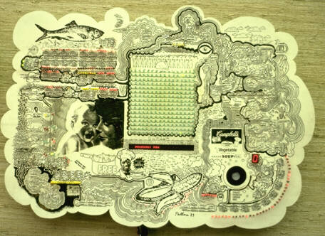 The FARMER JACK PIECE consists of three sculptures connected electronically. THE SHOPPING GODDESS is the largest of the three and controls the other two. THE SHOPPING GODDESS portrays a silhouetted woman with a shopping cart. Thought bubbles float from her head drift up behind her. The first is empty. The second shows three hungry mouths. The largest thought bubble is a 30" by 40" circuit board that combines working electronics with imagery relating to food production and distribution. These electronics collect information about human activities in Mr. Borman's office where THE SHOPPING GODDESS is located. The sensory information from these circuits is fed into an on-board microcomputer capable of linking to the corporation's main frame so that corporate data could be used in the sculpture. |