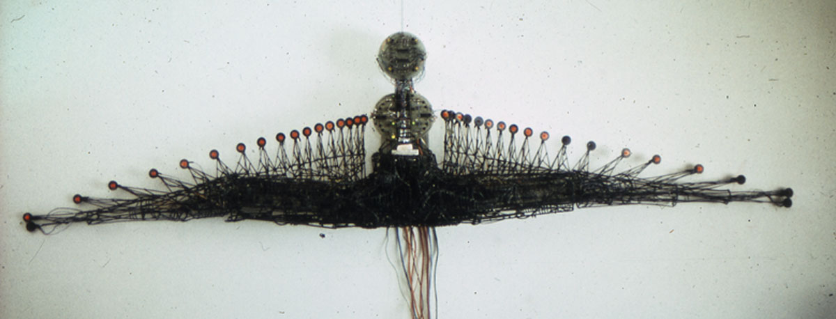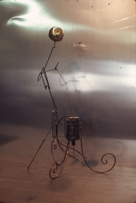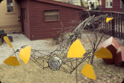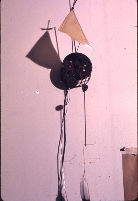 ![]() Mosquito Fish Snake. (1984) | A storm destroyed the Wind Feeler after David moved his residence to Novi, Mi. He asked that I replace it with an interior artwork, Mosquito Fish Snake, which could send Brain similar inputs. I created an input similar to that of the wind feeler with two light sensors. He also mentioned that he would like an alert signal when a car drove into his driveway so buried a magnetic sensor in his driveway and added a beeper to the new unit. |