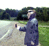 | It was dusk. It was deserted. The few commercial establishments were shuttered.Still apprehensive Janet said , "OK. This is good. Do what you have to do, and let's go." I said I wanted to walk a few blocks away from the station. She rolled her eyes but dutifully followed. We came to a church. I set the stand up on the sidewalk by the road and set the Hitchiker on it. We took some photos and started back. When we were about a block away, a young man in a car came down the road. We turned to watch. He went on by. Then he slowed and stopped. He backed up and leaned over and looked at the Hitchiker. He got out of the car and read the back. He picked up the cutout and started to load it in the car. At this point, we started walking back. He saw us. He noticed me and did double-take on my shirt. He looked confused, as though he thought maybe he had done something wrong. He started to return the Hitchiker . I protested. His English matched my French: nonexistent. Janet translated. We determined that his name was Pascal Gaillard of Rue Ferdinand Leger in Ville Juif. He was visiting his girlfriend nearby. He said he had friends who were going to the Montreaux Jazz Festival.that year. Maybe, they would take the Hitchhiker to Montreaux. We took his picture and helped him load it into his car. It was dark when he drove away. |