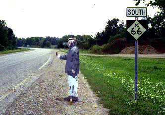 I thought "Cool!" when I learned that my sitting Buddha Hitchiker had showed up at the gallery. So I asked my father-in-law to stand against the plywood. I instructed Jason to stand off some distance and follow my hand with a mirror-reflection of the sun as I traced my father-in-law's partially projected shadow on the vertical sheet of plywood. I took a polaroid of my father-in-law in the pose. I cut out the plywood shape and painted it to look like the polaroid and gave it to him. After a few days, he wrote a message and set it on a nearby road trying to get it to his brother Hollie in Mt. Vernon, Illinois.