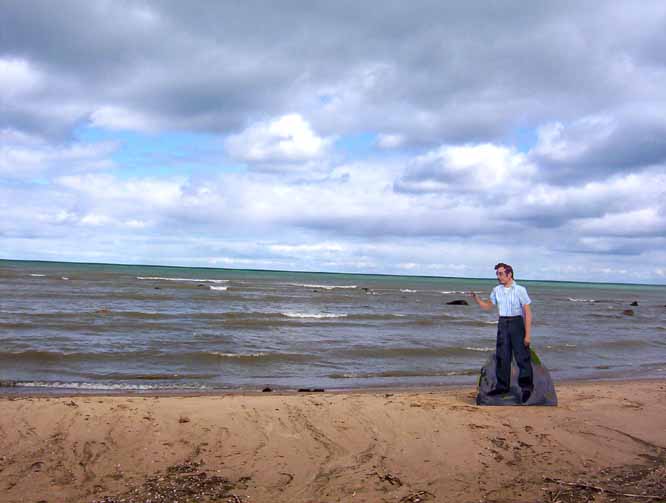Dressed for the west coast, Robert Noyce finds himself on the wrong, longer shore, Michigan's chilly Lake Huron edge.