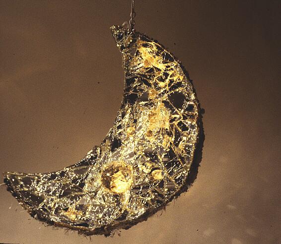 Beads, shells, buttons and mirror shards epoxied over painted steel. Illuminated from within by thirteen dimmable lights. (private collection, Grosse Pointe, Michigan)