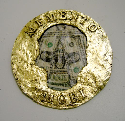 2008 11 1/2" dia. x 1 1/4" | Memento Mori (Dollar Bills, Gold Leaf) 2008 11 1/2" dia. x 1 1/4" |