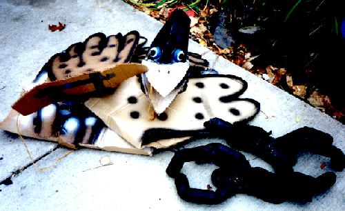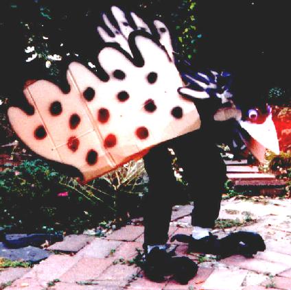 design donned a homemade, corrugated cardboard "bird" costume and walked